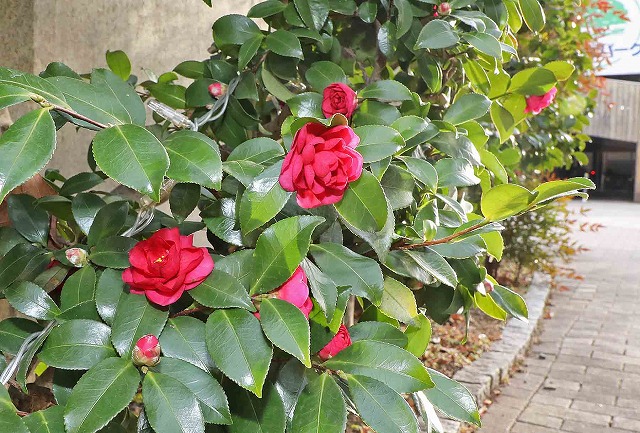 上田市海野町商店街の海野町パークでは「サザンカ」が赤い花をつけている。