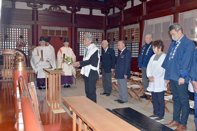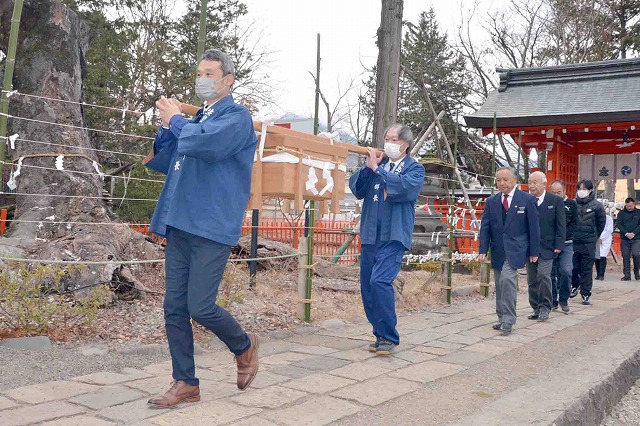 おかゆが入った大きなお椀を唐櫃(からびつ)に入れて主催者代表2人が担ぎ、社務所前から山崎洋文宮司や神職、工藤勇総代長らにつづき、本殿まで行列した。