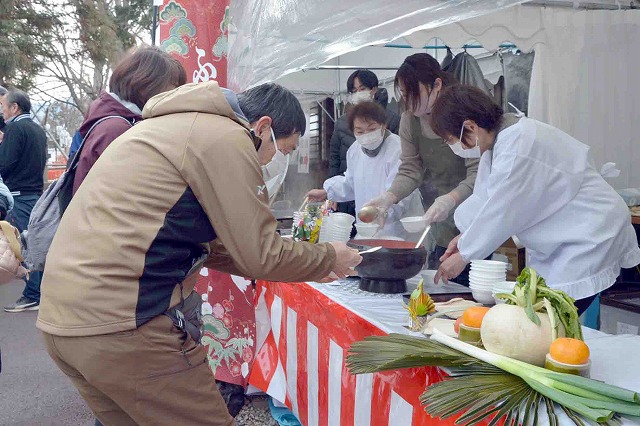 上田市の塩田を盛り上げる有志でつくる「塩田の仲間たち」(干場雅志代表)は、同市下之郷の生島足島神社で、7日「七草がゆの振る舞い」を行った。