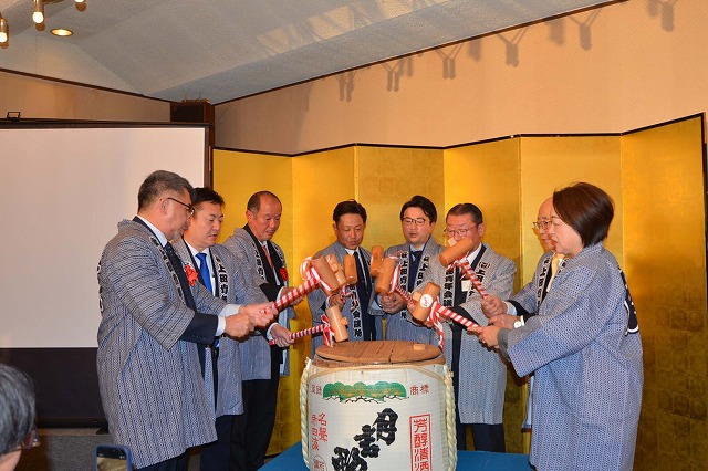 続いて来賓らの「鏡割り」があり、今年一年の飛躍を祝い、全員で乾杯した。