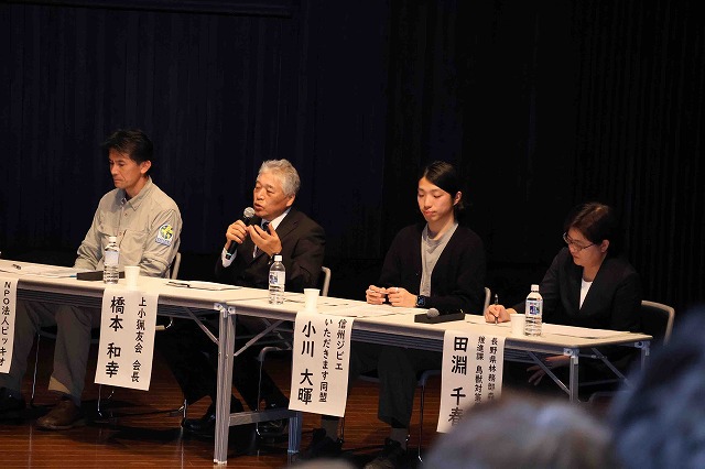 パネルディスカッションでは小泉さんをコーディネーターに、玉谷さんと上小猟友会長の橋本和幸さん(69)=青木村田沢=、信州ジビエいただきます同盟の小川大暉さん(33)=上田市上塩尻=、県林務部鳥獣対策係長の田淵千春さんが意見を交わした。