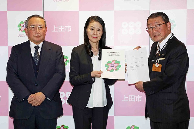 上田市文化芸術に関する基本構想策定委員会は、昨年8月に諮問を受けた「第三次上田市文化芸術に関する基本構想」についての答申を、上田市役所で土屋陽一市長に行った。
