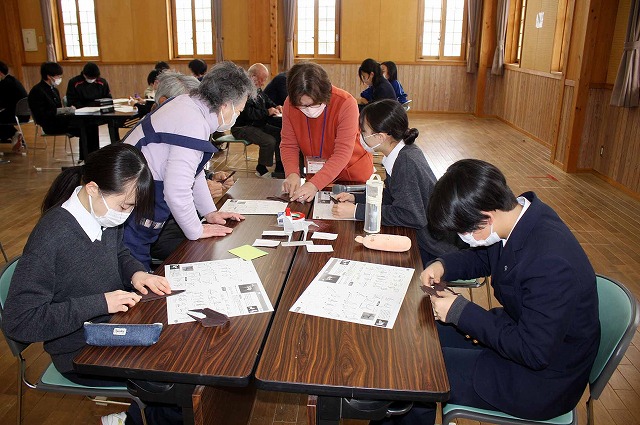 上田市の「しおだっ子応援団(塩田中学校地域学校協働活動運営委員会)」=大口義明団長=は、恒例の「春を待つ折紙講座」を同中「塩のホール」で開いた。