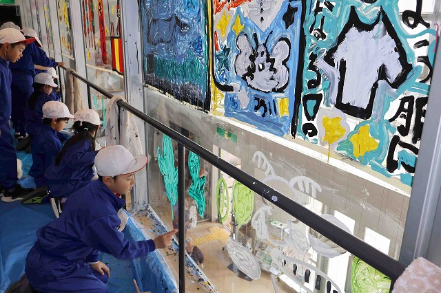 上田市の東小学校の児童が「窓ガラスアート」に挑戦! ☆近くの市中央公民館の「窓ガラス」に「色鮮やかな絵」を描く