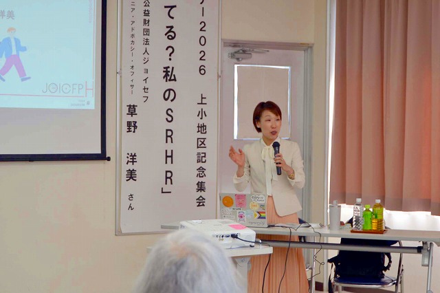 集会には公益財団法人ジョイセフのシニア・アドボカシー・オフィサーの草野洋美さんが「知ってる?私のSRHR」をテーマに講演。男女75人が参加して熱心に聴き入った。