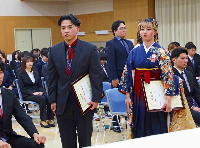 卒業生答辞は山崎柚那さんが、仲間との出会いや勉強の難しさ、国家試験への挑戦など3年間を振り返りながら「仲間のおかげで楽しい日々を送り、苦しい時も最後まで走り抜くことができた。柔道整復師としてあるべき姿を胸に刻み、これからの人生を歩みます」と述べ、指導への感謝なども語った。