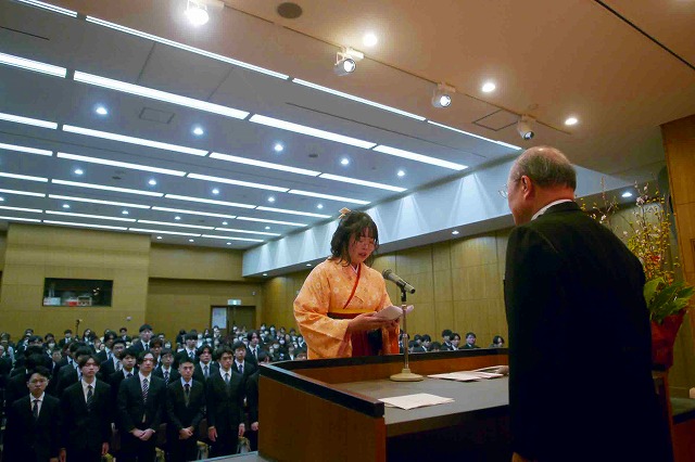卒業生代表あいさつで小林さんは「学びの集大成として取り組んだ卒業研究では、エコラン競技用車両を制作し、全国各地の大会二出場した。話し合いを重ね支え合いながら1台の車を完成させ走らせることができた達成感は深く胸に刻まれている。あすからはそれぞれ選んだ新しい道へと歩み出す。時には急勾配の坂道や先が見えない急カーブに差し掛かることもあるかもしれない。工科短大で培った技術と限界まで挑み続けた強さがあればどんな困難も必ず乗り越えていけると信じています」と述べた。