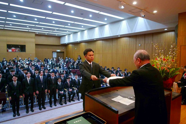 半田校長は式辞で「皆さんは2年間という短い期間に授業時間数が4年生大学より多く、ほとんどの科目が必修という大変厳しい条件のもと卒業に至った。これから社会に出るにあたり大きな自信となる。修得した知識や技術を発展させ、たゆまぬ努力で将来を切り開いて」と述べた。