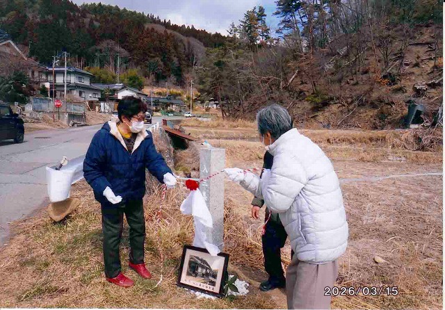 上田市上室賀の「入三(入組第三部落会)集会所跡地」に、このほど「標柱」が建立され「除幕式」を行って完成を祝った。