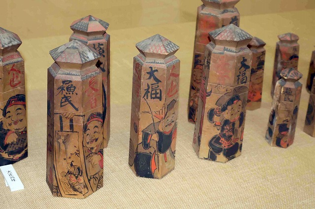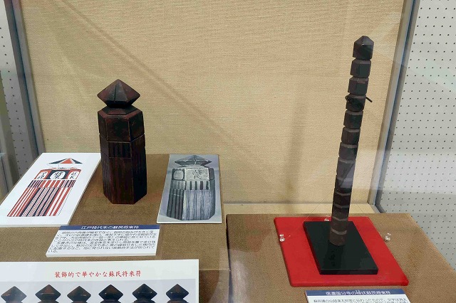 また、蘇民講の家に伝わった「棹(さお)状」の蘇民将来符や、他に見られない「装飾的手法」がされた江戸時代末の蘇民将来符も並ぶ。