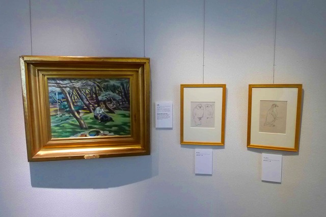「犬と紫陽花」(制作年不明)は、紫陽花の前に横たわる首輪をした黒い洋犬が描かれており、画伯の妻マリー・ルイーズ夫人と愛犬を描いた「松籟」(油彩、1939年)と同じ犬と思われ、同時展示している。